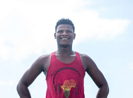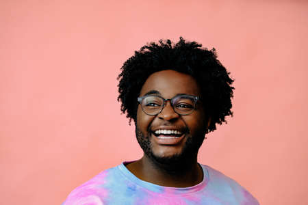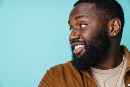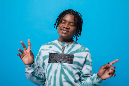 Portrait of African young man in bright shirt with bracelets on his arm posing at camera against blue background