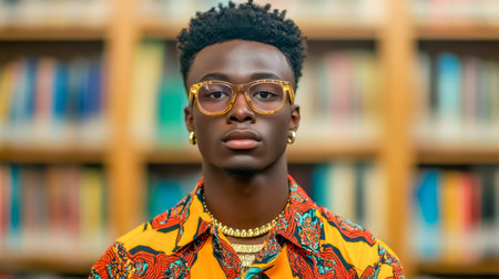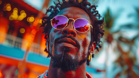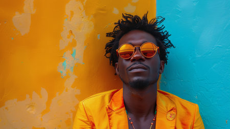 Close-up portrait of a stylish man wearing round glasses, a hat, and a yellow jacket. The vibrant background complements the bold fashion choices, emphasizing his unique style and confidence.