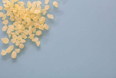 Mastic resin tears. Chios mastic on blue grey background, copy space