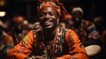 A cheerful group of people in culturally vibrant attire against a colorful backdrop. The scene conveys unity, friendship, and cultural identity, with bright yellow patterns symbolizing community and joy.