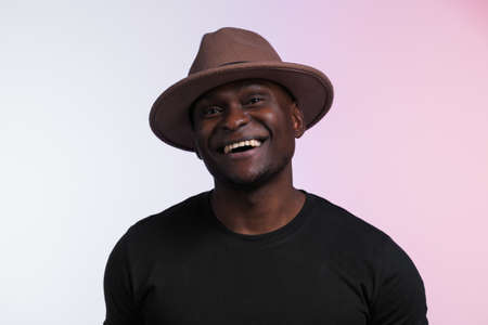 Smiling happy american african man wear stylish hat on white background. Festive and party concept