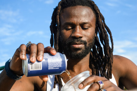 closeup of young African man with beard and dreadlocks, happy smiling outdoors at sunset pouring beer into a plastic cup, cooling off with a cold drink. lifestyles concept.