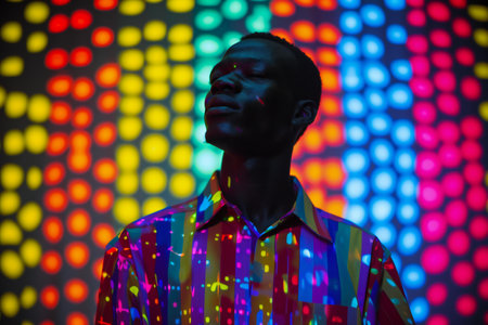 Young male model posing with trendy man fashion outfit and colorful orange optical art abstract background. Picturesque generative AI