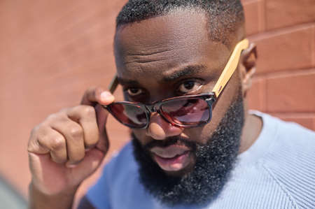 Close up Handsome African-American guy with glasses on the street. Portrait black man serious