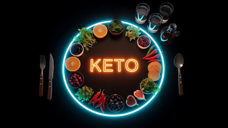 Keto meal arrangement with food and utensils in a neon-lit circle on a dark background.