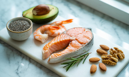 Fresh salmon steak, prawns, halved avocado, chia seeds, almonds, and walnuts arranged on a marble surface, representing a healthy diet rich in omega 3 fatty acids.