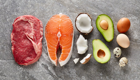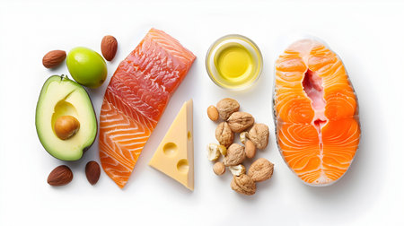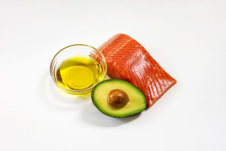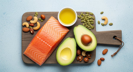 Raw salmon fillet, ripe avocados, olive oil, and a variety of nuts and seeds arranged on a wooden board, representing healthy fats and a balanced diet.