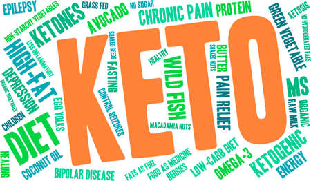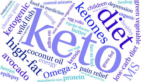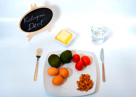 Concept of ketogenic diet. Poster written with diet foods like eggs, avocado, tomatoes and butter.