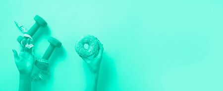 Female hands holding donut and measuring tape over mint color background. Top view, flat lay. Trendy green and turquoise color. Sweet, dessert, diet concept. Weight lost after holidays.