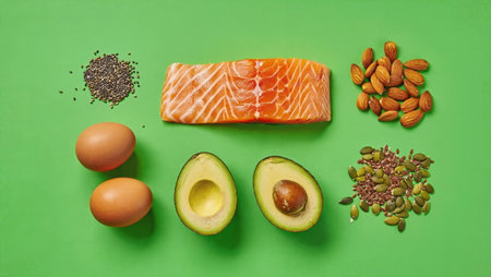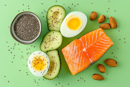 Vibrant keto diet ingredients salmon, avocado, eggs, nuts, and seeds on a bright green background