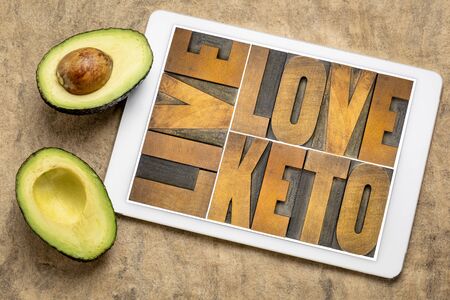 live, love keto, high fat ketogenic diet concept - word abstract in vintage letterpress wood type on a digital tablet with cut avocado