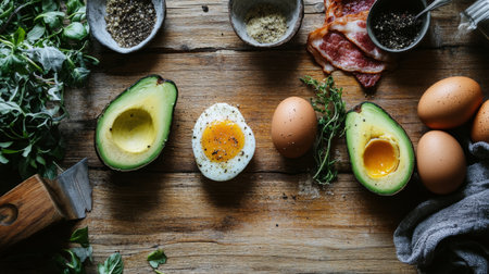 A vibrant arrangement of fresh ingredients for a healthy breakfast, featuring sliced avocado, eggs, crispy bacon, and aromatic herbs on a rustic wooden board.