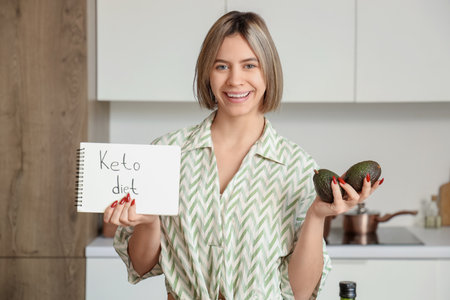 Young woman holding notebook with text KETO DIET and avocados in kitchen