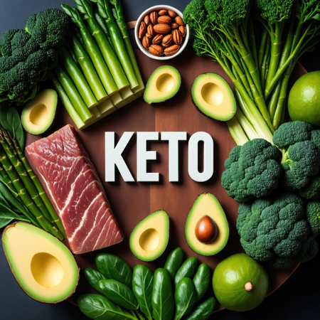 Healthy keto diet ingredients arranged in a flat lay on a vibrant green background