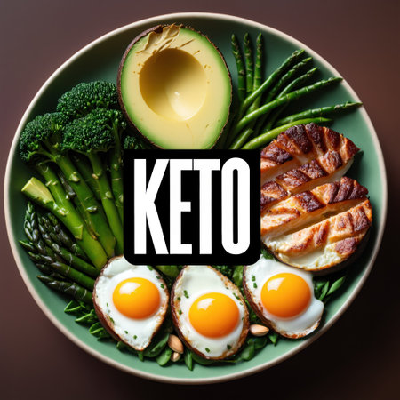 Keto meal preparation with fresh ingredients including eggs, avocado, cheese, and greens concept