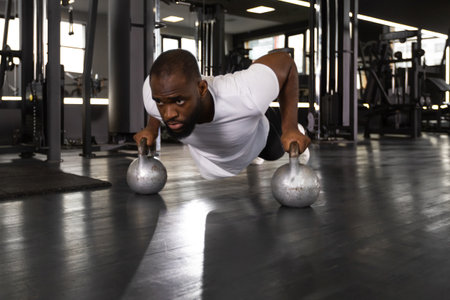 young man doing kettlebell push-ups in gym
