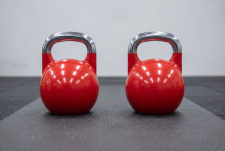 Two shiny red kettlebells with chrome handles sit side by side on a black textured rubber gym floor mat inside a fitness studio with a blurred background.