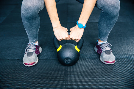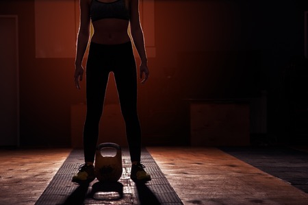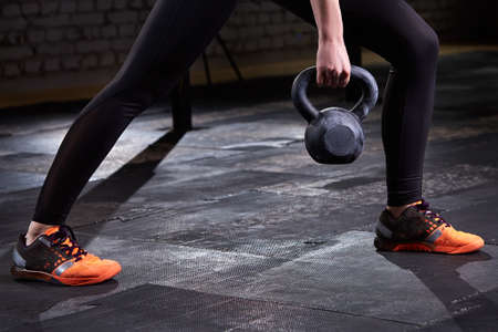 Closeup photo of young womans legs in leggings and sneackers and kettlebell against dark background.