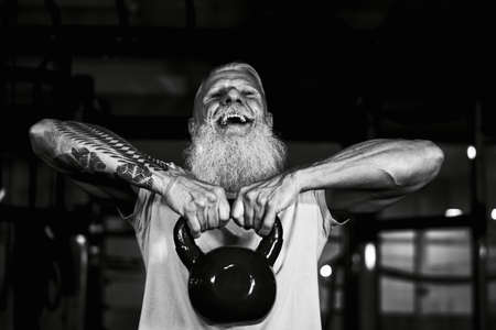 Senior fitness man doing kettle bell exercises inside gym - Fit mature male training in wellness club center - Body building and sport healthy lifestyle concept - Black and white editing