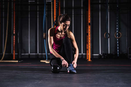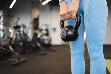 Young sporty girl preparing for kettlebell workout. Muscular woman doing exercises in gym.