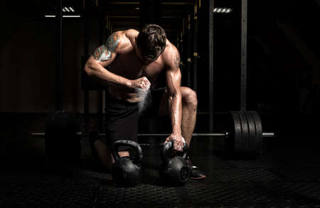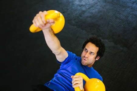 Man pulling kettlebells weights in the functional fitness gym. Kettle bell deadlift