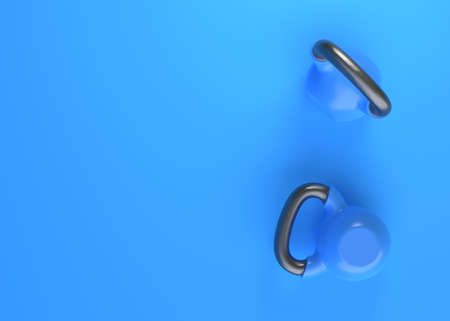Two blue metal kettlebells lie on a blue background. Top view. Gym and fitness equipment. Workout tools. Sport training and lifting concept. 3D render illustration
