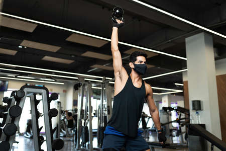 Muscular young man training with weights and lifting a dumbbell in the air in the fitness club