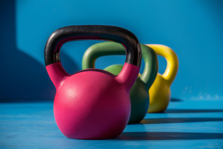 Colorful Kettlebells on Vibrant Blue Background for Fitness and Exercise Inspiration