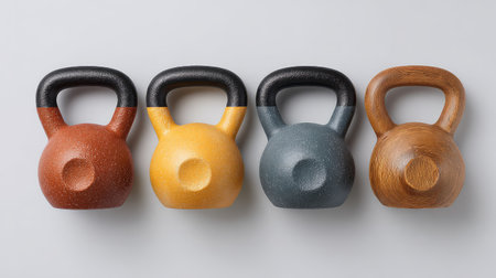 Four colorful kettlebells arranged neatly on a white surface, ideal for fitness enthusiasts looking to enhance strength training and workout routines.