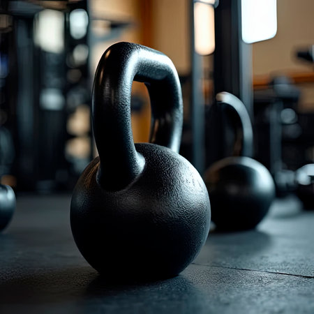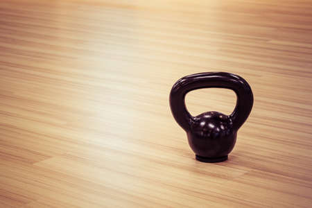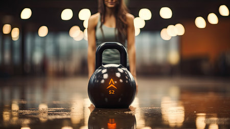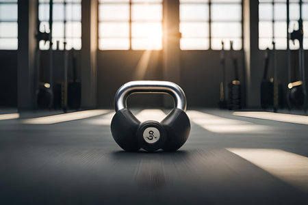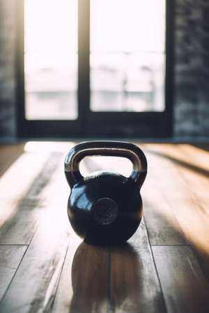 Close up wide angle view of a kettle bell weight on the floor of a gym with moody light : Generative AI