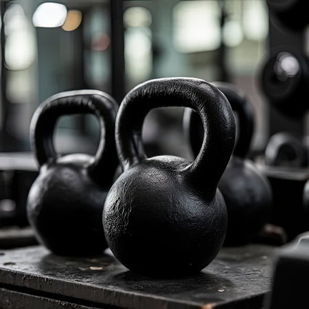 Fitness equipment on rustic wooden surface with kettlebell and workout mat suggesting gym activity at home