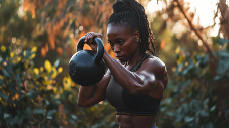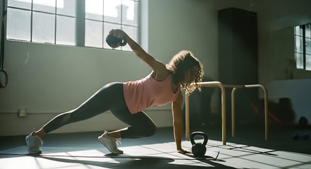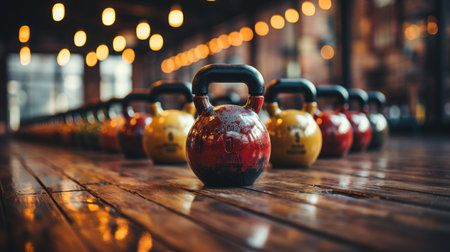 This striking close-up captures a vibrant color kettlebell on the gym floor, where a dedicated athlete is immersed in their fitness routine. It's a powerful image that represents determination and the pursuit of a healthier lifestyle. Ideal for fitness magazines, workout plans, gym advertisements, and sports-related content