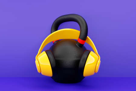 Sports background. Kettlebell and headphones with dumbbell on yellow background. Flat lay, top view, copy space.