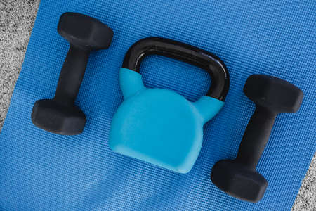 healthy and fit lifestyle concept, home gym equipment on yoga mat including dumbbells and kettlebell