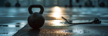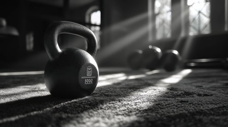 A kettlebell is positioned on a carpet in a gym filled with sunlight. The light creates striking shadows, highlighting the physical space. It's a serene moment amidst a fitness routine.