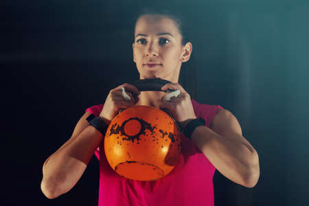 Woman in gym holding a kettlebell. Working Out at Crossfit.
