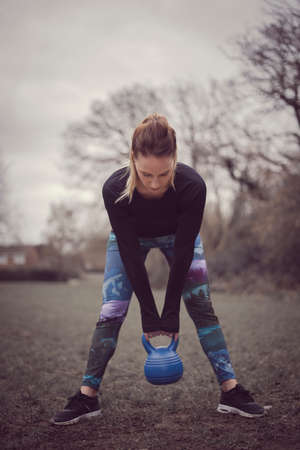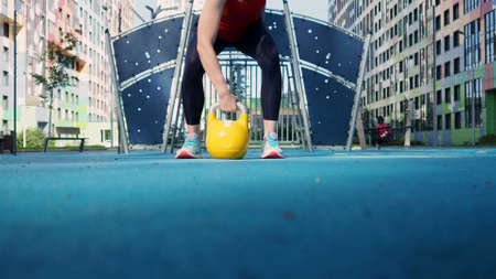 Get started. Young female athlete doing workout, training with a kettlebell in the open air. lift a kettlebell, foreshortening from below, a kettlebell between your legs