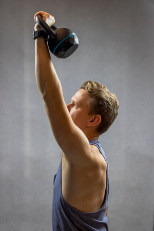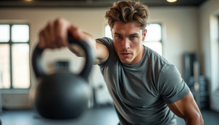 A determined young man with tousled hair is intensely lifting a kettlebell, showcasing strength and dedication in a sleek gym environment. The image captures the essence of fitness and motivation, highlighting the mans muscular physique and unwavering focus on his workout.