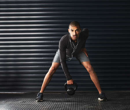 Its not going to lift itself. Shot of an athletic young man working out with a kettlebell in the gym.