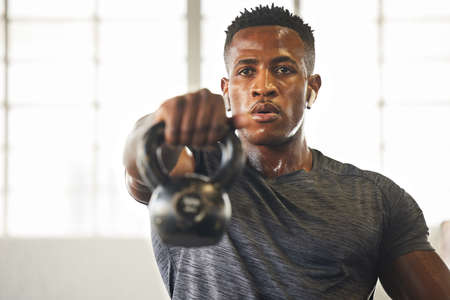 Visualise the goal, then go for it. a muscular young man exercising with a kettlebell in a gym.