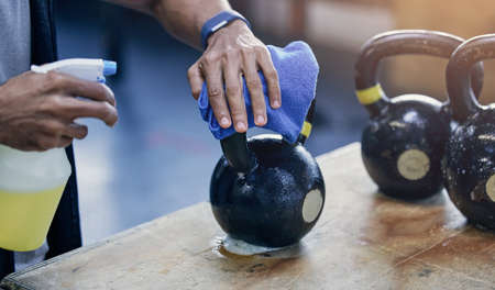 Reducing risk of infection so you can exercise safely. Closeup shot of an unrecognisable man sanitising a kettlebell while working in a gym.