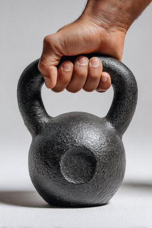 Close-up of hand holding heavy black kettlebell on gray background. Concept of fitness, strength training, gym workout and physical exercise