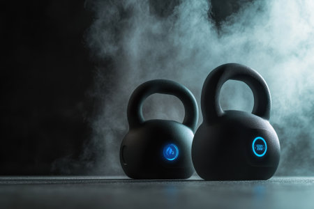 Two black kettlebells shine with blue lights, surrounded by a smoky atmosphere, emphasizing a workout environment.