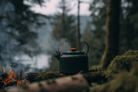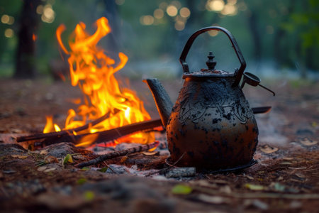An old kettle beside a warming campfire in a tranquil forest environment as evening falls
