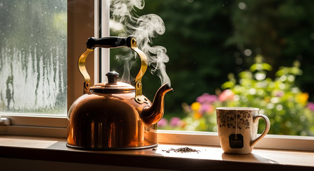 A copper kettle sits on a dark surface, steam billowing from its spout, creating a cozy atmosphere. Morning light reflects off the kettles polished surface, enhancing the warmth.