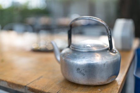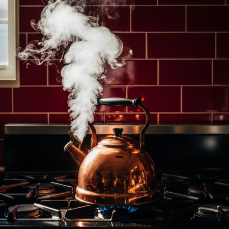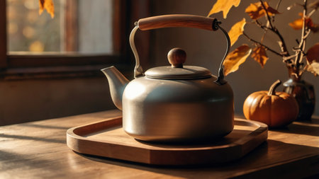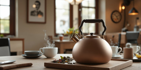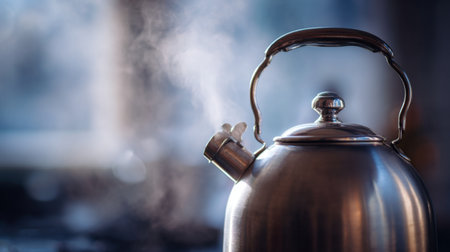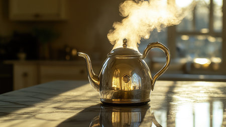 A shiny metallic teapot emits steam in a warm kitchen, capturing a moment of relaxation and comfort. Ideal for culinary or home decor themes.