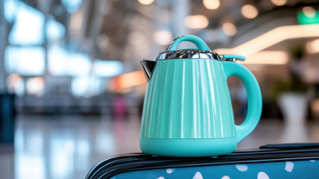 A chic teal kettle elegantly positioned on a suitcase in a bustling airport terminal, capturing the essence of modern travel with soft lighting and sleek design.