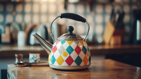 This image features a vibrant vintage kettle placed on a wooden kitchen table, capturing a cozy atmosphere, with a blurred modern kitchen backdrop.
