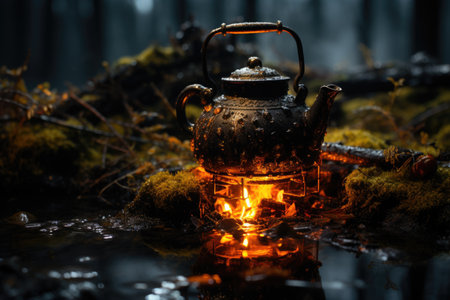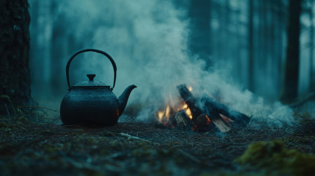 A rustic metal kettle sits by a crackling campfire in a mystical forest, surrounded by smoke and shadows. The scene embodies tranquility and adventure.