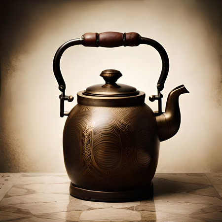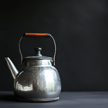 A shiny vintage kettle rests on a dark kitchen counter showcasing its elegant shape and wooden handle under soft light.